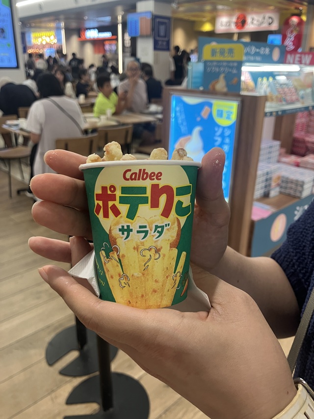 海老名SAにはカルビーキッチンがあると彼女が言い、できたてのじゃがりこ(ポテりこ)を食べました。出来立てはホクホクでおいしかったです。その後レストランに入り、お昼ゴハンはレストランでトンカツを、彼女は天ぷらのセットを、食後にはソフトクリームを頂きました。