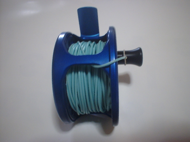 もちろんこのサイズですから標準では#3ラインが妥当なサイズでしょう。指定はDT-1+50yd(20lb)、DT-2+30yd(20lb)、DT-3+15yd(20lb)とのこと。そこで使い古しのエアセルのシュープリーム2BBT#6の根元を10mほどカットして巻いてみるとちゃんと収まりました。フロートチューブから釣るのであれば20m程度あれば問題無いでしょう。ブルーのラインもちょうどピッタリです。