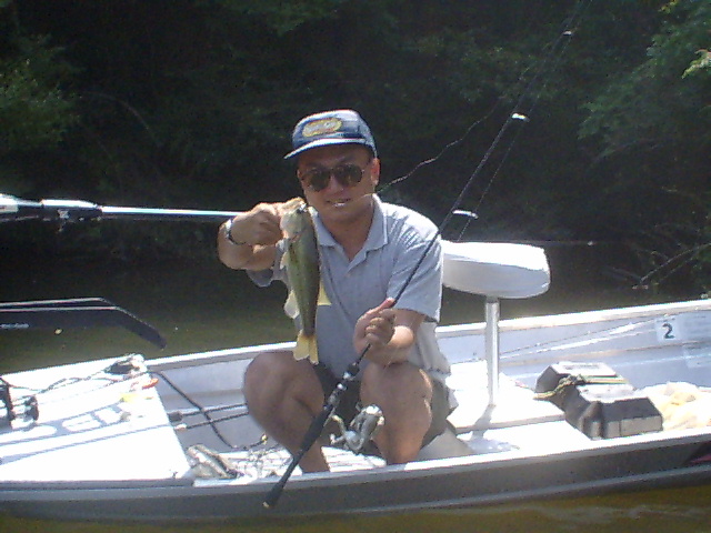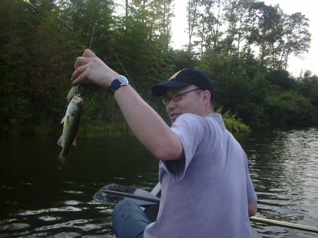 カヌー組はトップのルアーを延々投げまくり。10時頃まで音沙汰が無いまま、Aくんと落ち合うまでは辛い釣りになってしまいました。Aくんはワームやラバージグで小さいバスを5匹程釣ったとのこと。出だしは良かったがギルが突ついているようだとの感想でした。