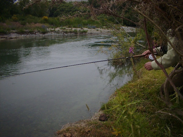 川岸のブッシュの上に恐る恐る立ってみると、ちょうど狙いやすいポジションで魚の姿もよく見えます。