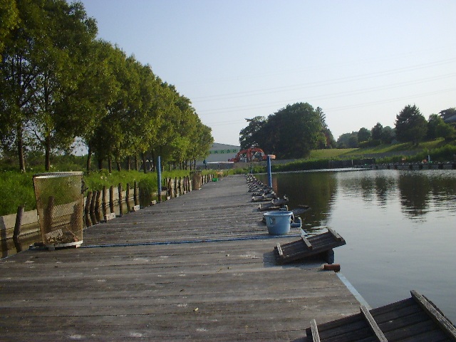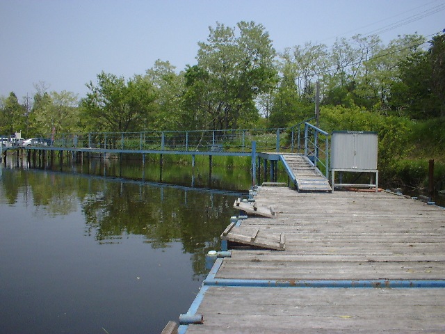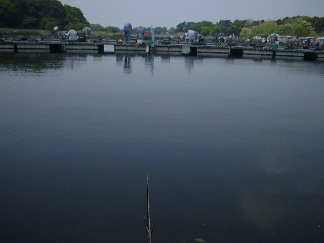 端の松桟橋だとちょうど背後の木が風除けになっていて、水面を見ても一番さざなみが無く釣りやすそうです。岸に近いところではハタキ(産卵活動)のせいか時折バシャ!と魚が跳ねているようです。結局松桟橋の入り口から4番目に釣り座を決めました。