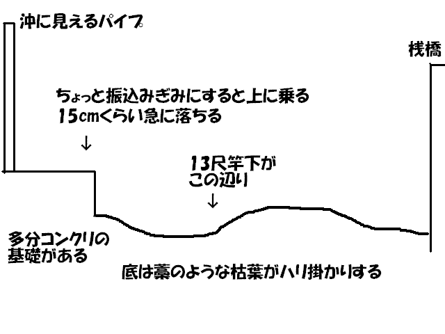 とりあえず13尺で底釣りをすることにしましたが、辺りの底を取ってみると、どうやらややこしそうな地形のようです。