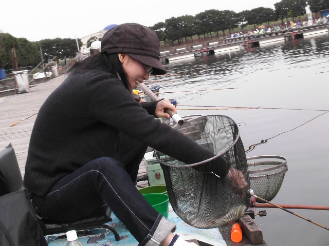 一方で隣の彼女もやや苦戦しているようです。よくみると振り込んだ後、ウキが沈没するケースが増えてきました。ウキがなじんだ後の返りもゆっくりです。どうやらバラケえさに混ぜたGTSが粘りを出してきたようです。
