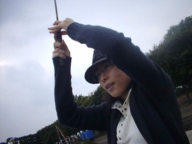 腹拵えをした後、いよいよ釣り開始です。僕がビデオ撮影をしようと構えると彼女がまだまだ釣れないよと暢気に言います。じゃあ、と自分の仕掛けを作り始めると、なんとまだ4、5投めくらいなのに鋭くあわせているではありませんか。