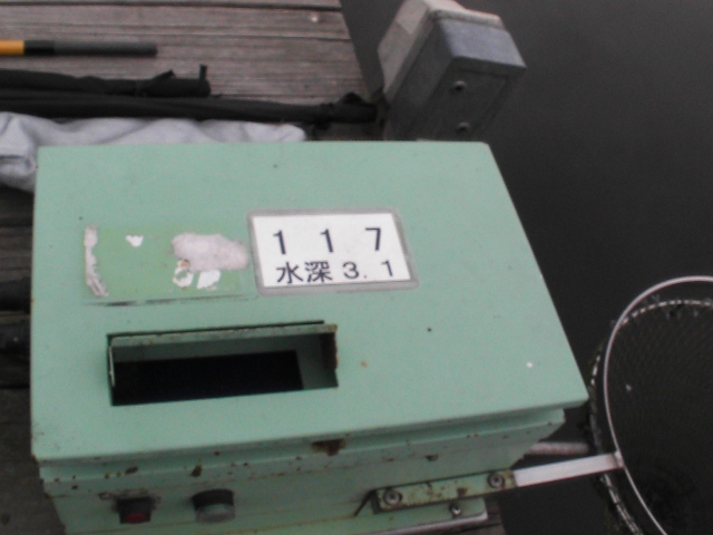 釣り座は、空きの多い1号桟橋の、入り口に近い117,118番に入りました。検量機に貼られたシールをみると水深は3.1mとのことです。