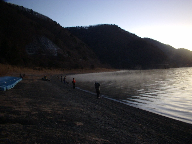 さて、富士山の写真を撮るカメラマンの合間を縫って、浩庵ワンドの湖岸に入りました。車を停めた時にはまだ真っ暗だったので、夜明けを待つのだろうと少し仮眠を取っていたら、程無く釣り支度を終えた皆さんが行きますよと起こしてくれました。暗い中ヘッドライトを駆使して準備をしていたのでした。