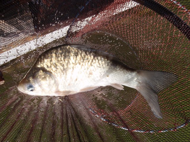 とはいえ4投めにはウキにサワリが出ます。居るけど食わないって話だし…と小エサでバラケを持たせぎみにして、しつこく誘うようにすると小さいながらも鋭いアタリが出ました。待ってましたとあわせるとギュンと絞ります。いかにも冬の段底って感じだなぁとニンマリしながら魚を寄せるとポッカリ浮いてきたのは尺近い良型でした。