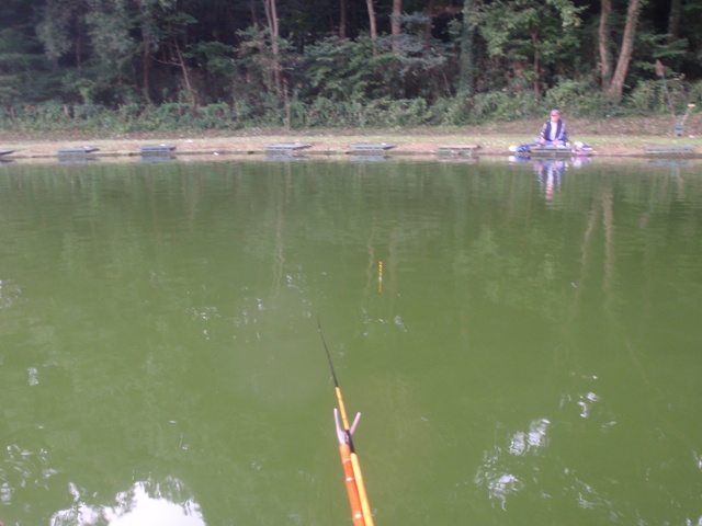とはいえ落ち込みの釣りは禁止とのことですから、トップがなじみ切ってから返すまで待ってから合わせます。普段は上ずり防止のためあまり早いアタリはとらないのですが、待ってもいいアタリが出ません。基本的に底に着いていないのか、はたまた底に着いたえさは警戒されているのか、このあたりが底釣り専用池のクセというものでしょうか。