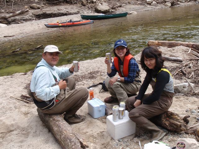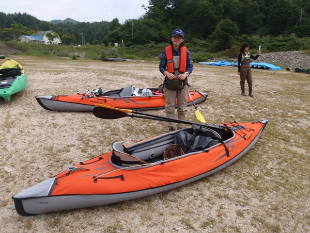 荷物を降ろしてカヤックに空気を入れ、荷物を積み込みます。今回はカヤックで最上流まで行った後、川を遡りますので渓流釣りの準備で乗り込みます。