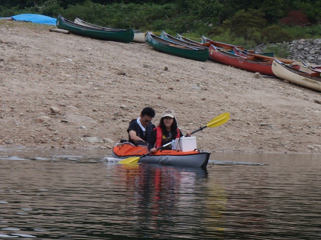 帰りは釣りもしないでガシガシ漕いでいきます。フルさんミンさん艇には申し訳ないのですが、ここは2馬力の威力でドンドン先に行きました。彼女はパドルを持つ手の皮が擦り剥ける程の勢いです。実は湖上で暗くなってしまったら凄く怖いことになると思ってからなのですが、それがヒシヒシと感じられたので僕もバンバン漕ぎましたヨ(笑)。