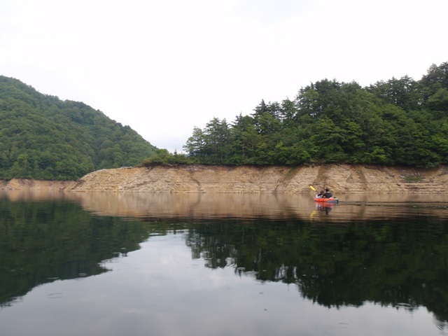 出発したのは11時30分頃でした。いざ湖上に出ると風も無く、穏やかな湖面は鏡のようで実にカヤック日和です。かなり減水しているので湖岸は地面がむき出しになっていて、緑の中を颯爽と…というわけにはいきませんが、水は澄んで綺麗ですので、気分は上々です。