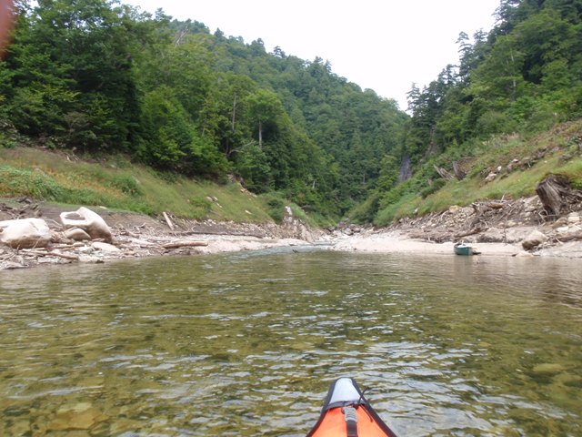 結局何の反応も無いまま、最上流部へとやってきました。すると左岸に一艇のカナディアン(オープンデッキ)カヌーが泊まっているではありませんか。やはり同じようなコトを考えている人が居るのね…。