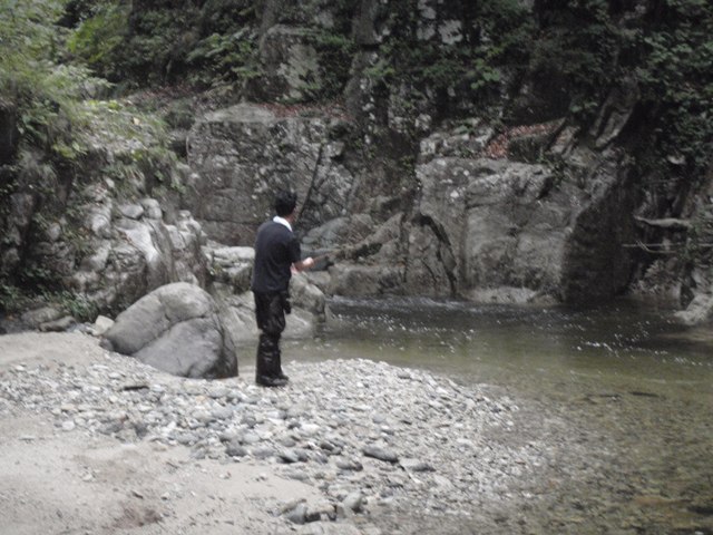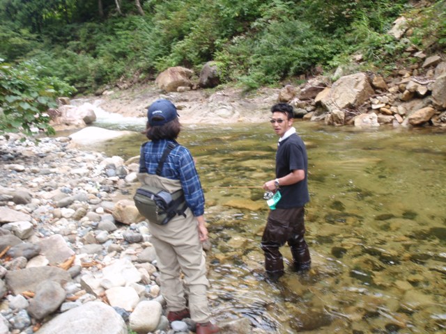 彼女は、フル先生に釣りの方法を教えて貰いつつ、川歩きを満喫できたのではないかと思います。魚の方はというと、コレ!といったポイントに魚影は無く、浅い瀬を走る魚の姿が少し見えたくらい、といささか寂しいものでした。
