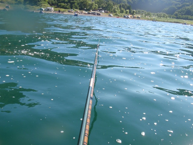 西湖の湖上は涼しげで気分は最高です。左側に着けたエノさんはダイワのへらF18尺を出しています。僕は5月にヤフオクで落札したシマノ飛天弓 閃光G25尺を取り出します。冬まで出番が無いだろうと思っていましたがここなら使えると長竿チョウチン両ダンゴをやります。