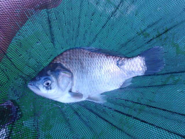 そんなわけですっかりえさを打つペースが遅くなってしまいました。こんな状態じゃせめて1ボウルくらいは打たないと状況は掴めないよね…と思っていたら、1ボウルめの残りが少なくなってきた頃、ウキに動きが出てきました。ようやく魚が集まってきたのかしら?とえさを少し小さめに付けてみると、良いアタリが出ました。