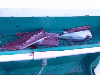 この3本をキッチンバサミで3枚にさばき、えさにします。右側のトモのお客さんが包丁を貸してくれたのですが、まな板が無いのでキッチンバサミの方が使いよかったです。包丁のお礼にサバの半身をあげたら、喜んでくれました。