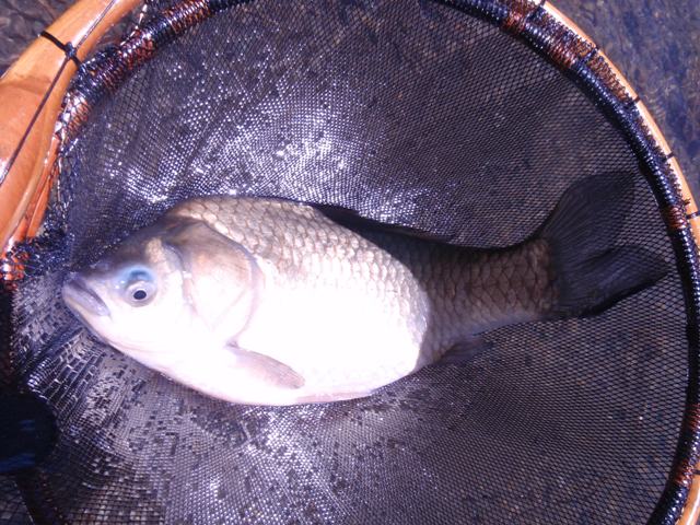 丸々太った、いかにも産卵前の魚です。隣のエノさんは順調に数を伸ばし、数度ハリスを飛ばされています。数はともかくウキの動きが気持ち悪いです。釣った感が欲しい…。