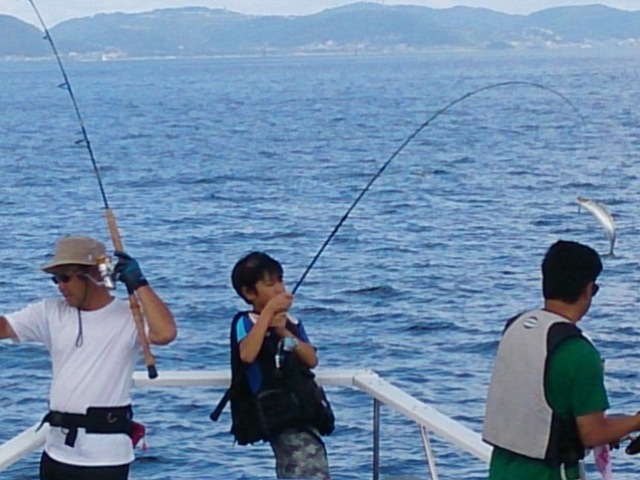 この日は夏休みのお子さんを連れてきていた方がいて、彼はシイラ釣り初挑戦とのことでした。朝イチにイワシの泳がせ釣りで船中第1号を上げ、サバも一生懸命たくさん釣っていました。良い経験になったかなぁ。釣りがますます好きになってくれるとオジサン達は嬉しいよ。
