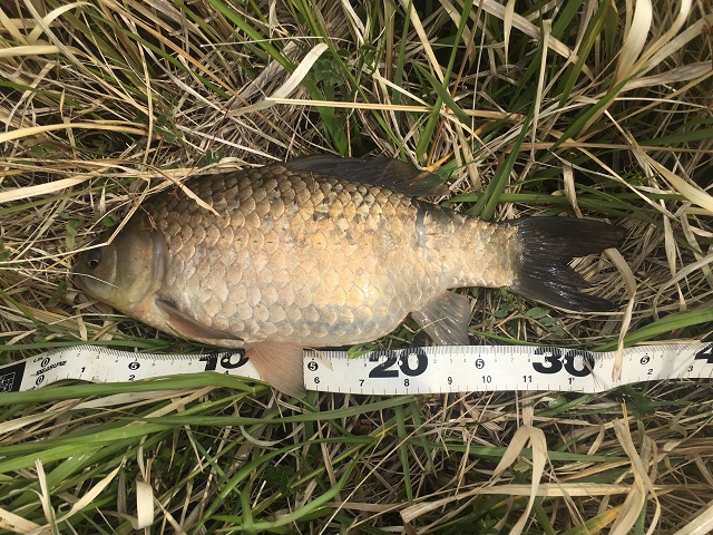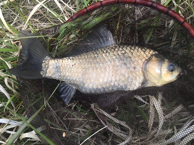 タモに収めて引き上げると立派なマブナです。珍しくメジャーを持っているので長さを測ってみると33cmありました。