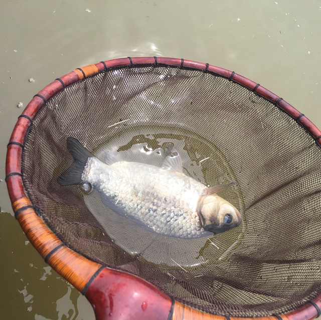 竿を溜めて魚のヒキをいなして、水面に誘導すると魚の姿がギラリと見えます。マブナじゃん!デカいよ?