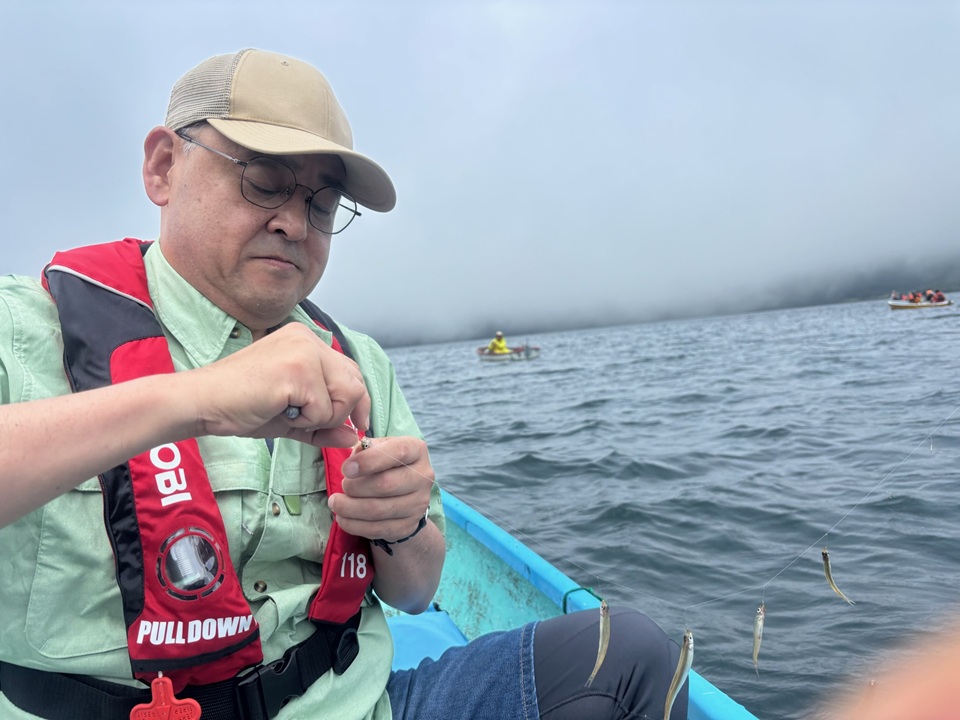 まずはボートを曳いてくれたお兄さんがワカサギ釣りの経験は?と訊くので、以前に元箱根で一度だけと答えると、元箱根よりこっちの方が早く釣れ出して、サイズもこっちが大きいですと対抗意識がチラリと覗きます(笑)。