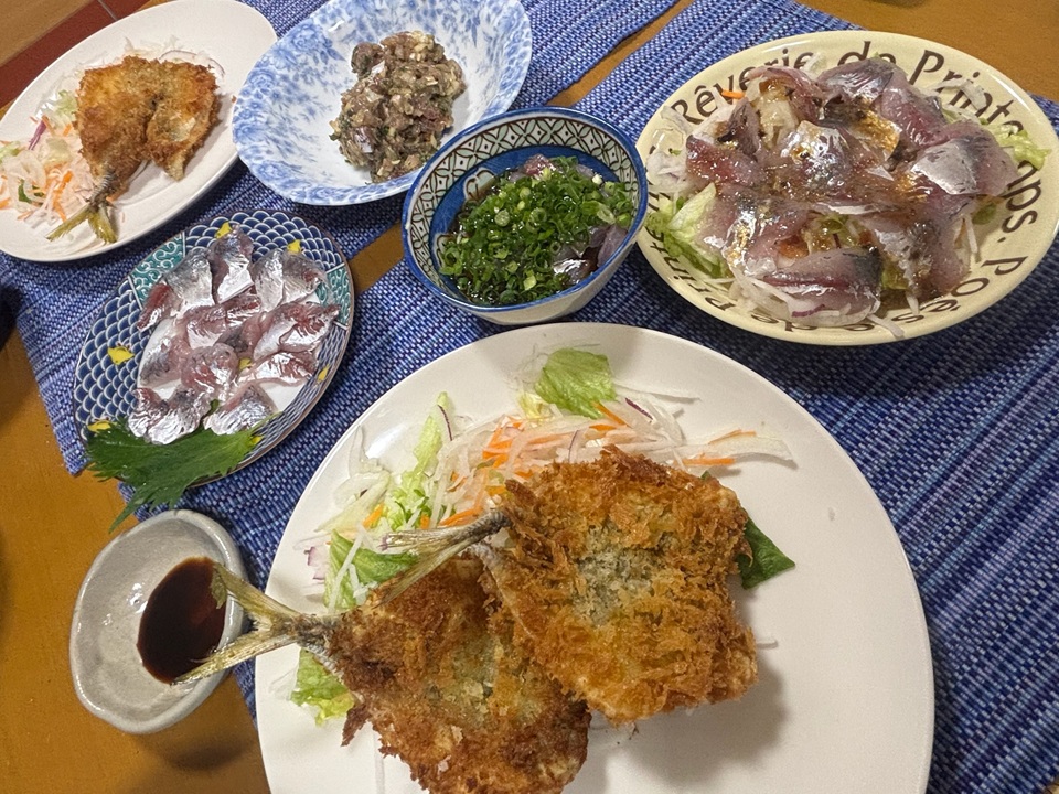 翌日の日曜日に改めてアジ祭りを開催しました。献立はアジフライ、お造り、カルパッチョ、なめろう、タタキです。