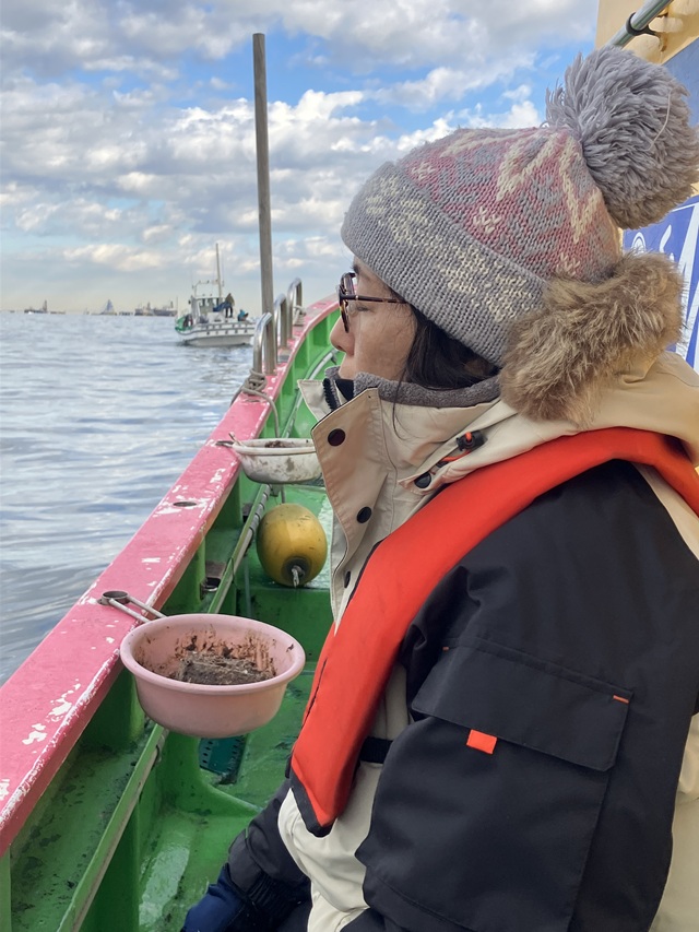 しばらく釣りをして船長が船を移動させます。重油の積み込み施設のようなところに着きました。Google Mapで確認したらJERA東扇島火力発電所LNGバースというところのようです。この頃、彼女の仕掛けが絡まってしまい、大丈夫?解こうか?と訊いたら大丈夫と返事があったのですが、あえなく船酔いしてしまったようです。