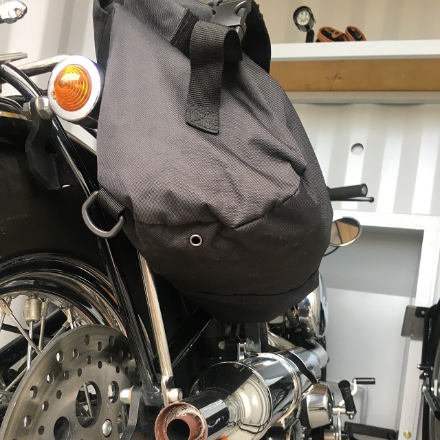 9月17日に装着テストをしたところ、やはりバッグの底がマフラーへ接触してしまいます。スナップ環が長いのでバッグが垂れ下がるようです。