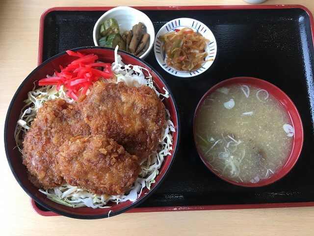 八千穂レイクを出発し、キャンプ場へ帰る途中のレストハウスふるさとで遅いお昼ゴハンを食べます。山賊焼き定食と悩んだ末、ソースカツ丼にしました。