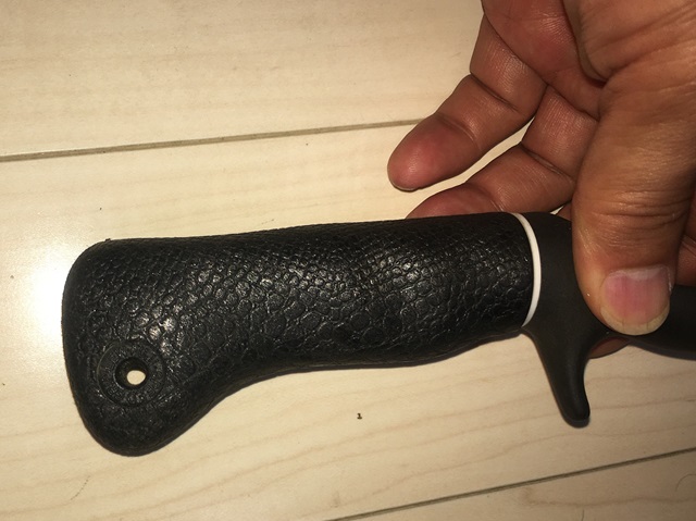 グリップは往年の定番ガングリップ。皆、これが恰好良いと憧れたものです。素材はラバーで結構硬く、シボが入っていて滑り難いです。グリップに穴が空いているのは昔からずっと、そして今もって謎なのですが、落下防止の紐でも通す想定なのでしょうかね?この穴のせいなのか、富士のこのグリップはお尻の膨らみが小さめです。