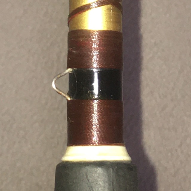 ガイドラップに目を向けると、金色の塗装の上に茶色の糸でオープンスパイラルの飾り巻きが施されています。コントラストが出て見栄えが良くなりますね。コーティング剤は薄く、糸目が見えるどころか爪先で引っ掛かります。
